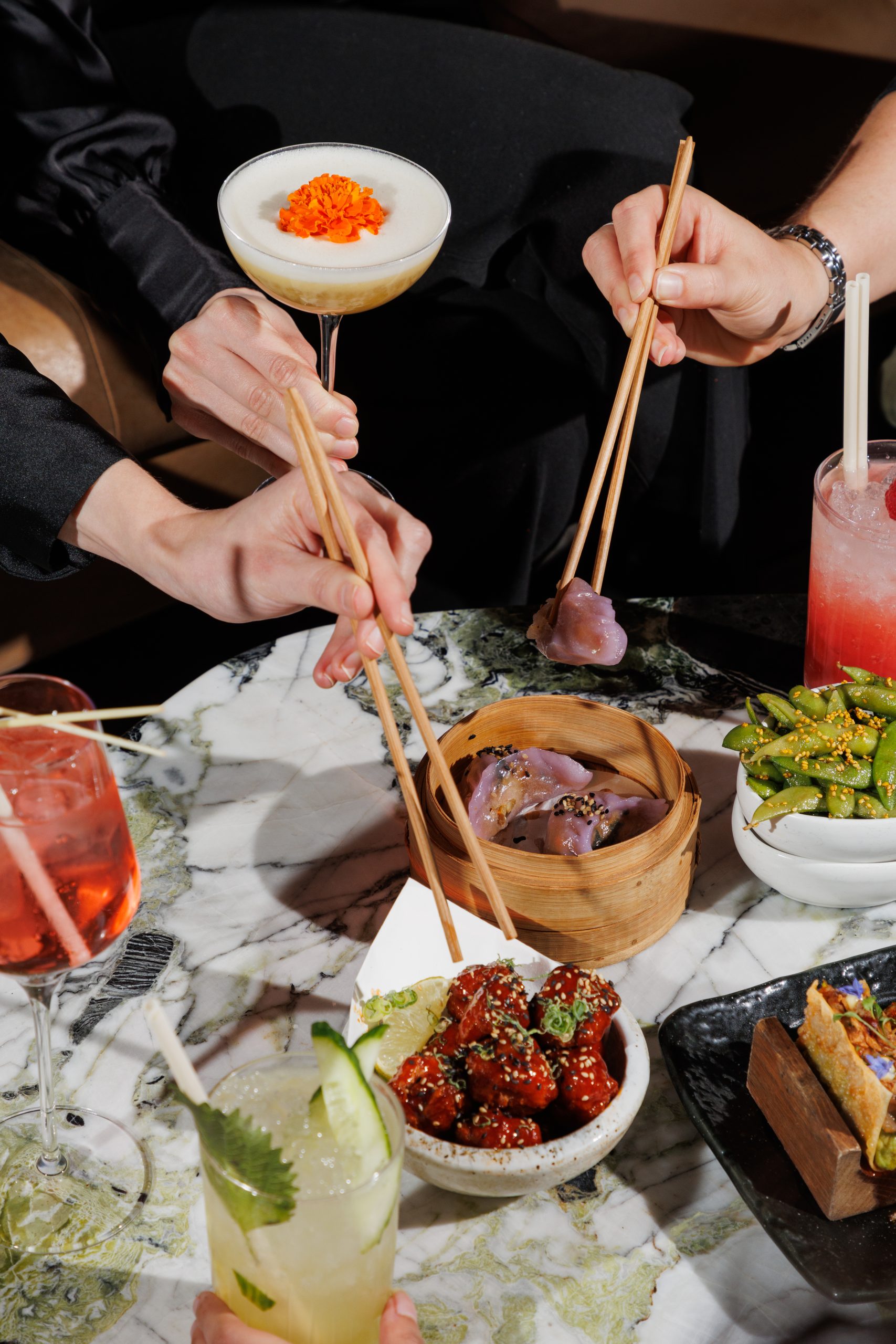 Try the Mango Fuji, where Rum and Absinthe meet Muyu Jasmine Verte and Mango Zen Tea for a bright, layered drink. Or go for the Shiso Spritz, which combines Gin, Japanese Shochu, cucumber, and lemon for a clean, refreshing drink.
